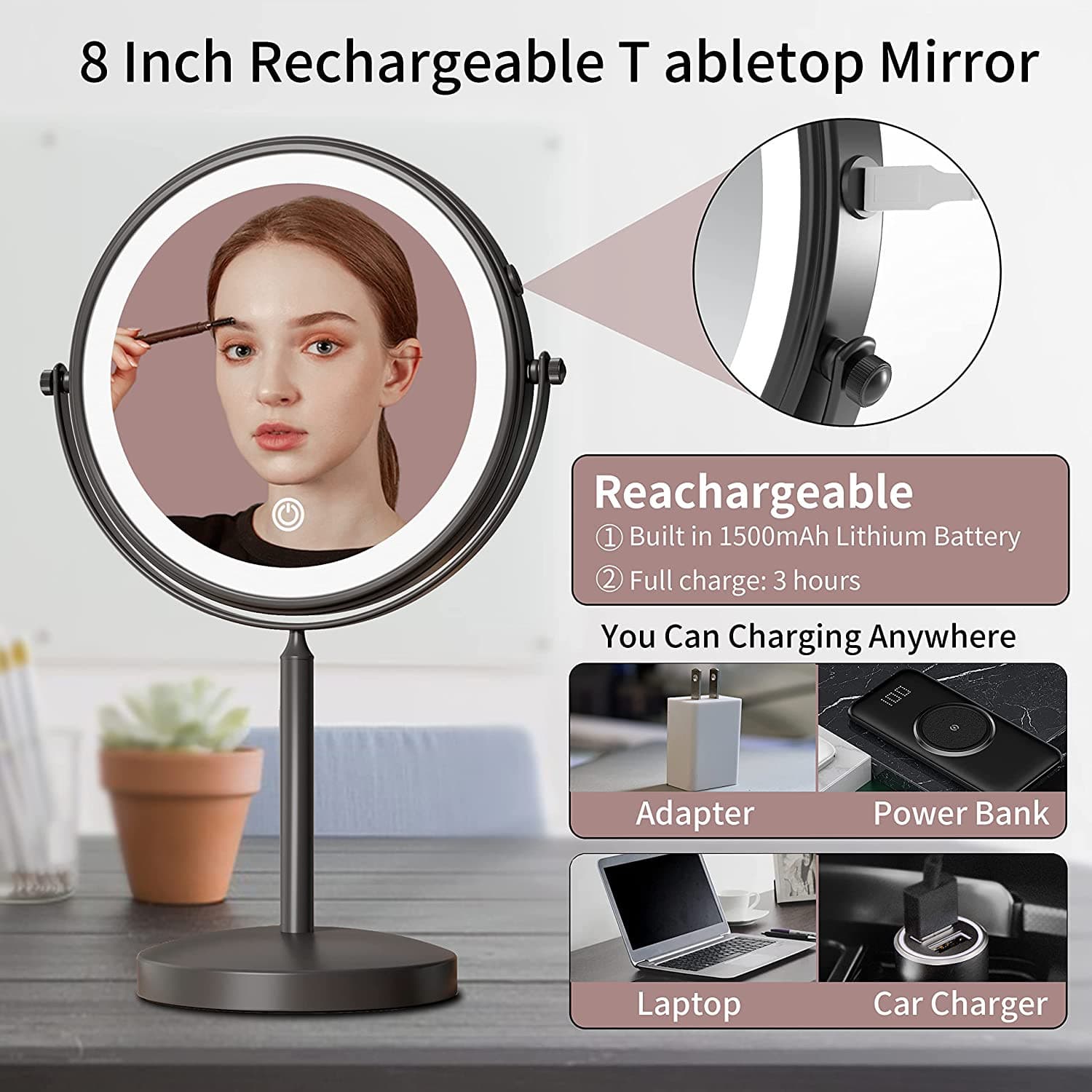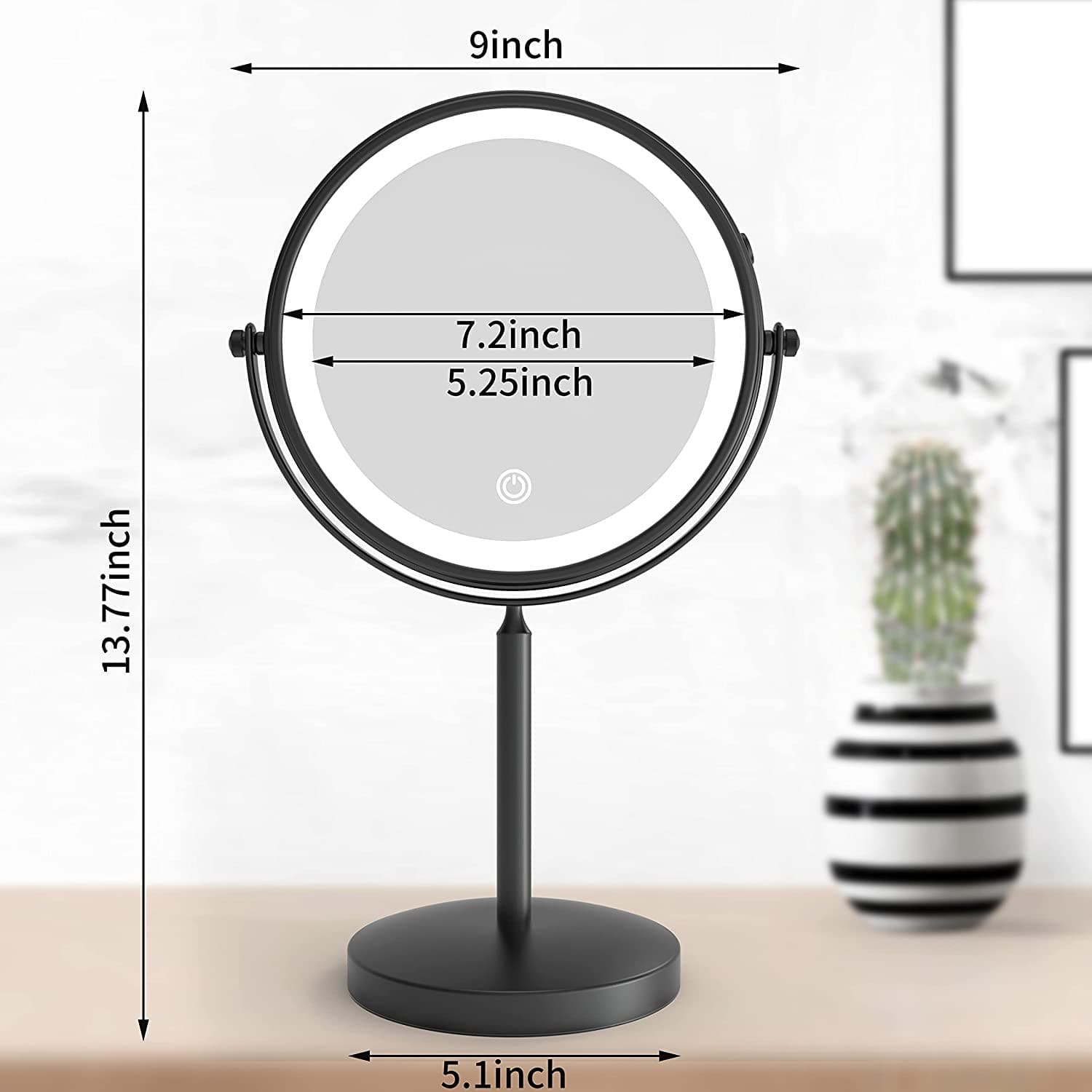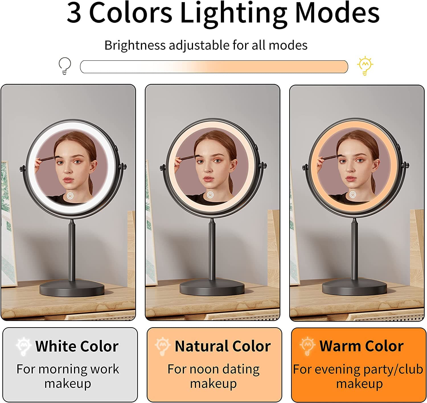 Fixsen Two-Sided Swivel Standing Cosmetic Mirror is easily portable and rechargeable, offering a most convenient makeup experiences. This LED lighted makeup mirror with matte black coating easily crosses style boundaries and adds a higher level of modern style to any home decor. With 3 color modes (white/yellow/white+yellow), short press the sensor to switch within the on light/color change/off light, long press the power button to adjust the brightness. A great holiday gift for Christmas, New Year, Mother's Day and etc. Also a great choice for sisters, wives, girlfriends, and makeup artists. 10x magnifying makeup mirror is suitable for bedroom, bathroom, hotel, private car and travel. It is not only a professional makeup mirror, but also can be used as a desk lamp and night light.