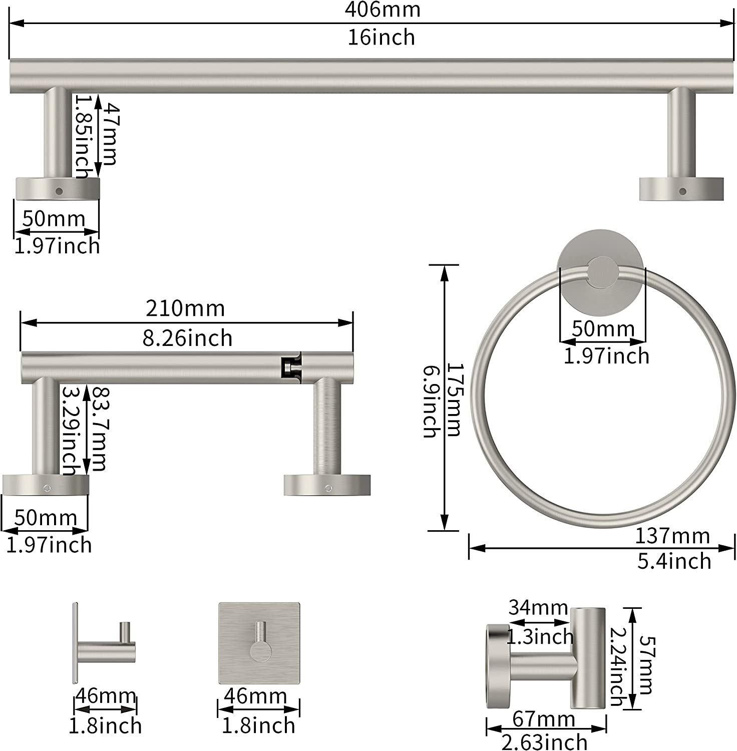 - Durable: Durable and rustproof. The 6-pieces bathroom hardware set for bathroom including 16 inch towel bar, toilet paper holder, towel ring, towel hook,2pcs 3M adhesive hooks. They are made of high quality 304 stainless steel. The most ideal material for humid environments, suitable for using in bathrooms, kitchens, and RVs. This bathroom toilet paper holder is designed to last and rustproof design ensures your toilet paper stays clean and hygienic.